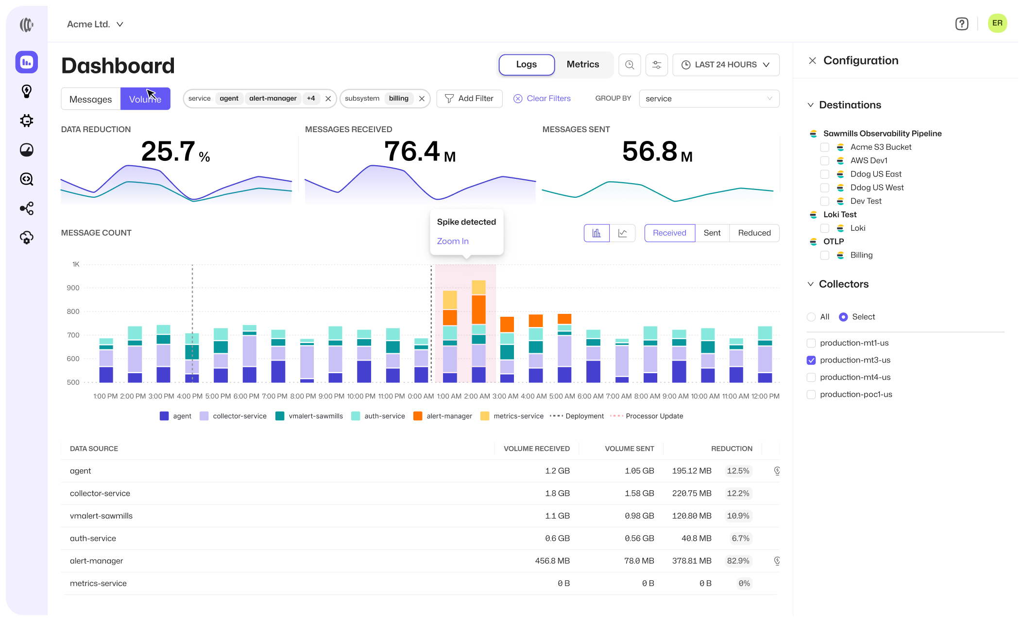 Spike protection automatically throttles excess data to prevent backpressure and database saturation, while maintaining visibility into what's being filtered and why.